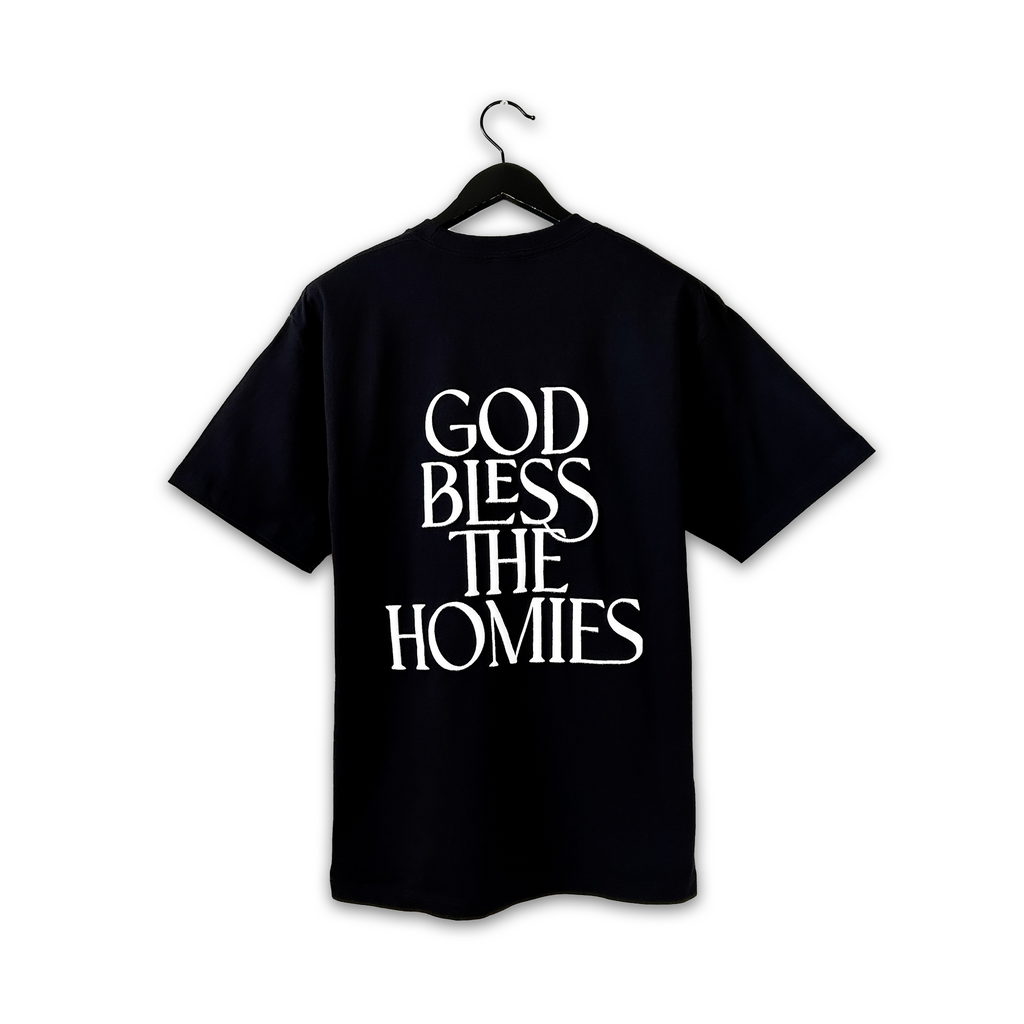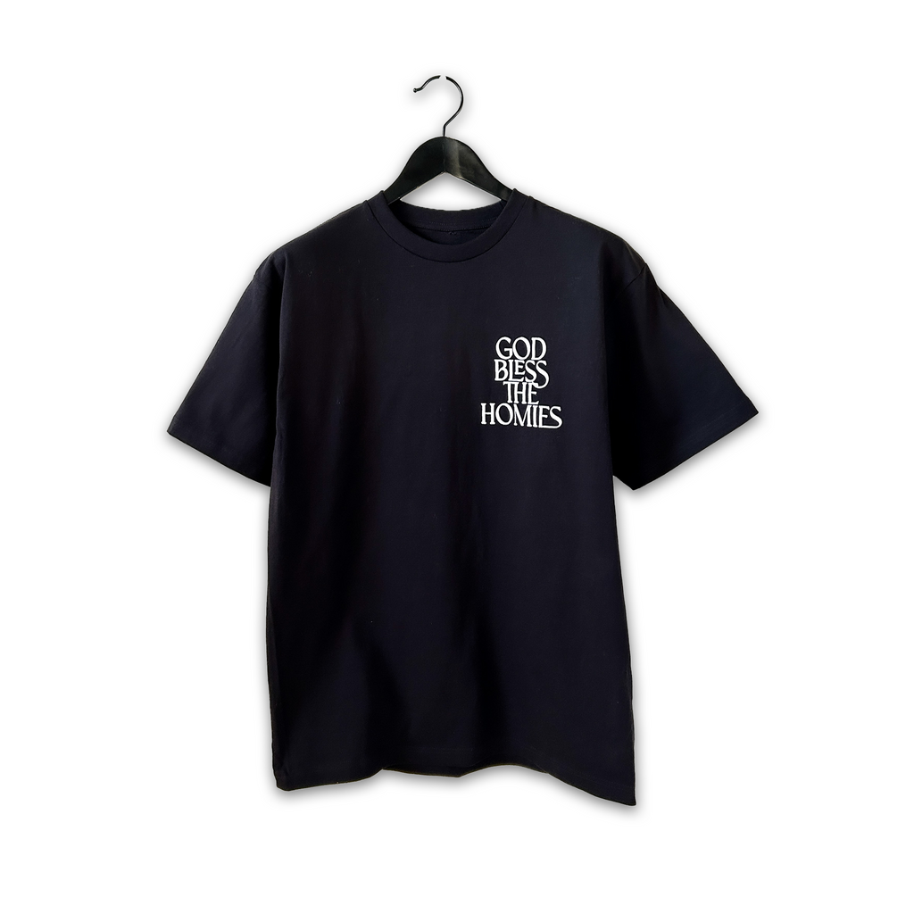 Feel spirited and stylish in our God Bless the Homies t-shirt! With its vibrant Black and White color bold puff screen printing, it'll be your go-to piece for summer fun. Show your loyalty and let love radiate with a style that'll make you shine!