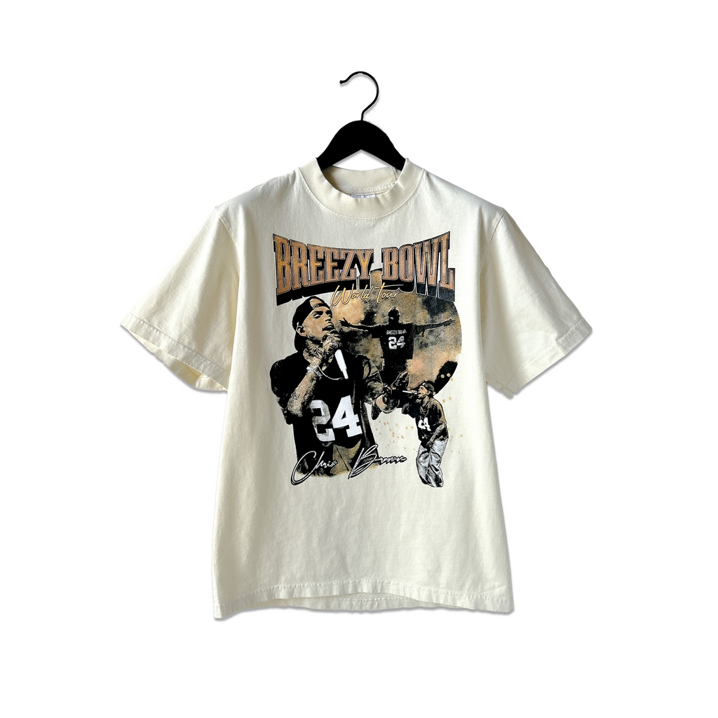 Introducing our Brezzy Bowl T-shirt! This heavy weight oversized box tee features our exclusive Chris Brown Brezzy Bowl design, screen printed to perfection. Choose from three stylish colors: Vintage Black, Off-White, and Moca Brown. Order yours now!